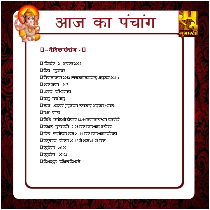पंचांग राशिफलहमारी संस्कृति आज का पंचाग By demilation - August 21, 2025 0 109 Share Facebook Twitter Google+ Pinterest WhatsApp