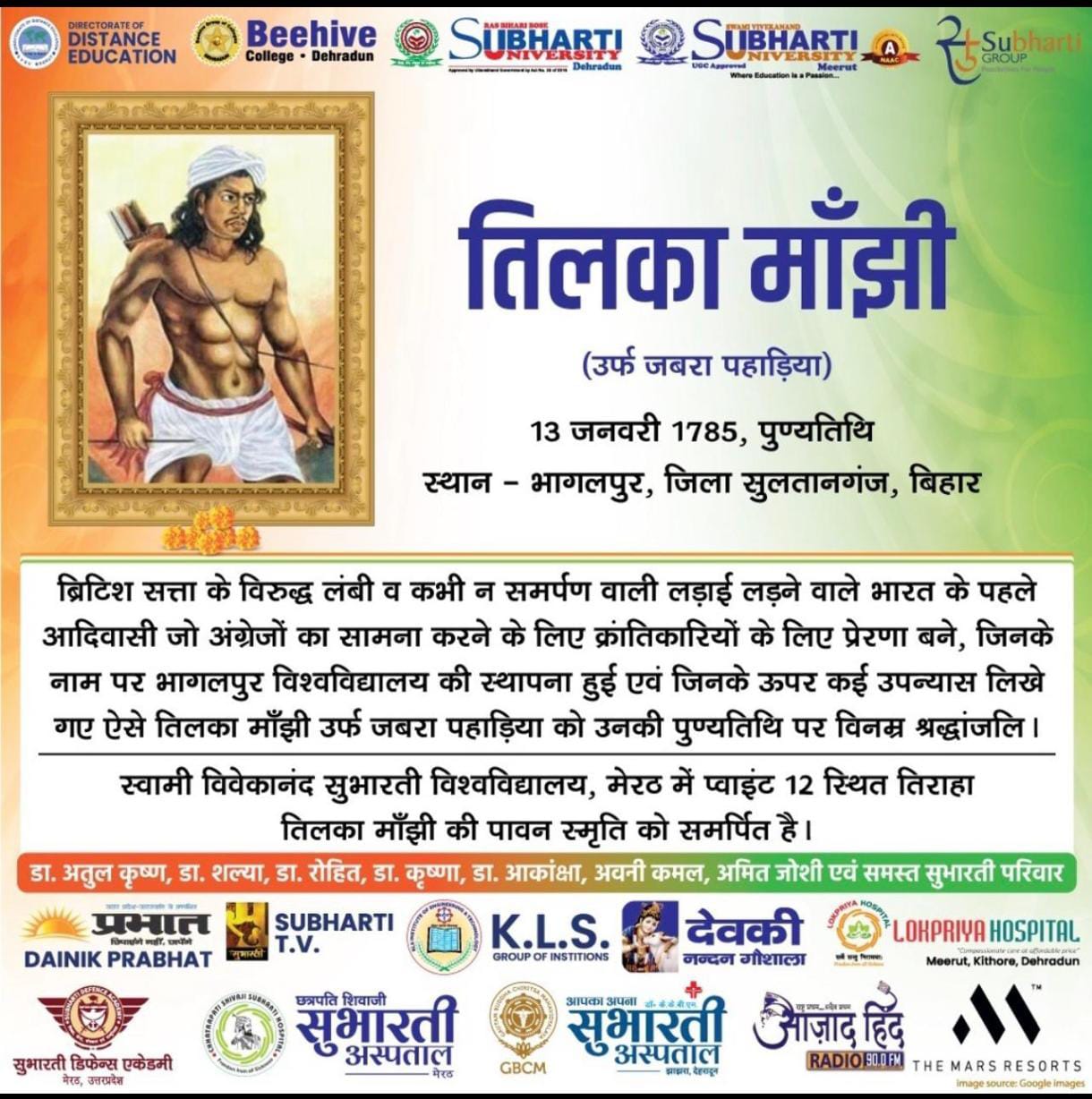 आज, हम भारतीय स्वतंत्रता संग्राम के महान योद्धा तिलका माँझी (जबरा पहाड़िया) को उनकी पुण्यतिथि पर नमन करते हैं।