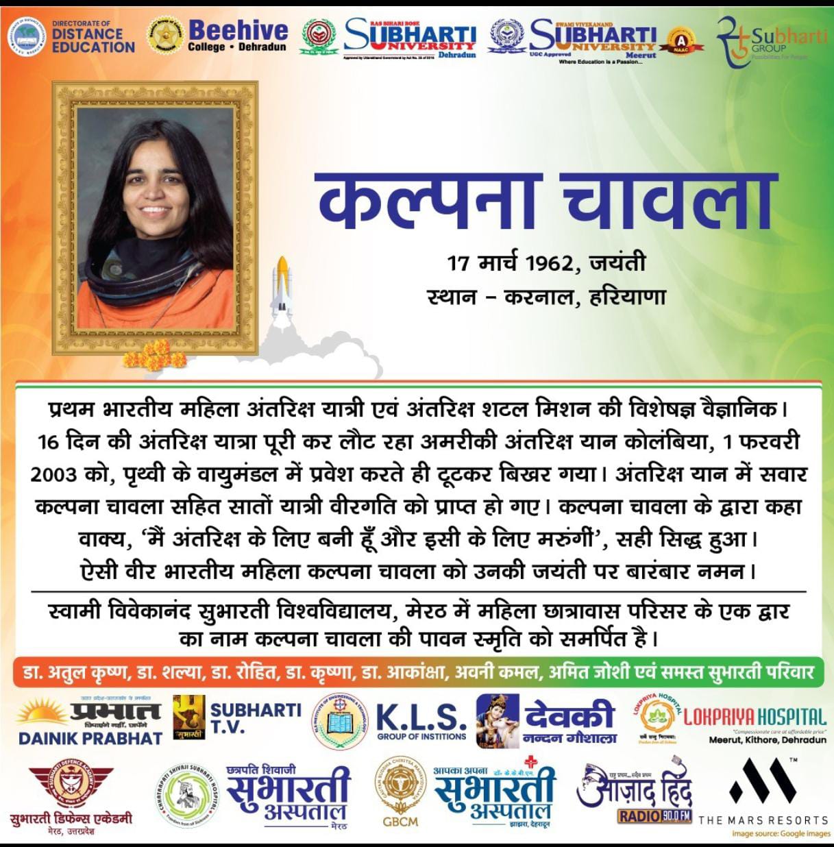 आज हम भारत की महान बेटी और विश्व प्रसिद्ध अंतरिक्ष यात्री कल्पना चावला जी की जयंती पर उन्हें विनम्र श्रद्धांजलि अर्पित करते हैं। उनका जीवन साहस, परिश्रम और बड़े सपनों का प्रतीक है। हरियाणा के करनाल से निकलकर अंतरिक्ष तक पहुँचने वाली कल्पना चावला ने यह साबित कर दिया कि यदि व्यक्ति के अंदर दृढ़ संकल्प और लगन हो, तो कोई भी लक्ष्य असंभव नहीं होता।