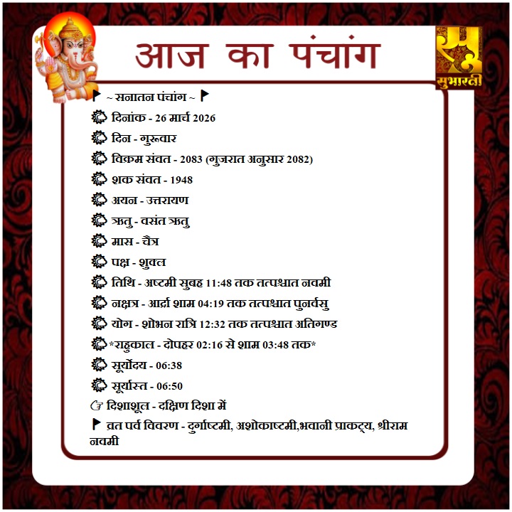 पंचांग राशिफल 26 मार्च का पंचाग By demilation - March 26, 2026 0 35 Share Facebook Twitter Google+ Pinterest WhatsApp
