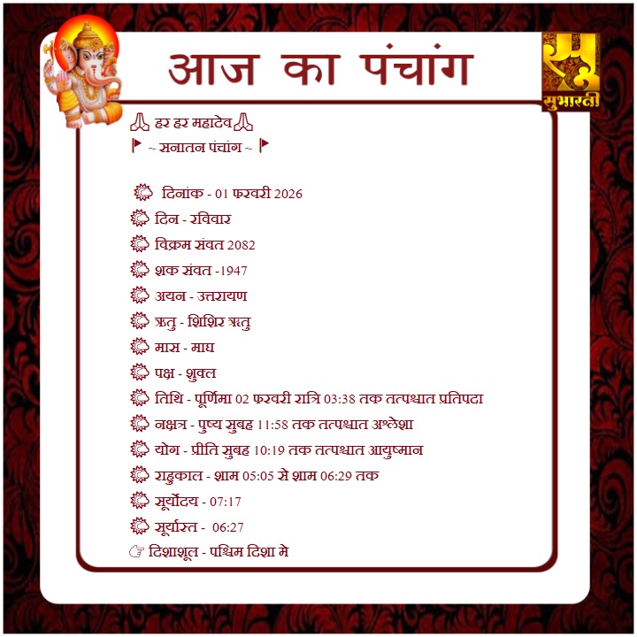 पंचांग राशिफल 01 फरवरी का पंचाग By demilation - February 1, 2026 0 53 Share Facebook Twitter Google+ Pinterest WhatsApp