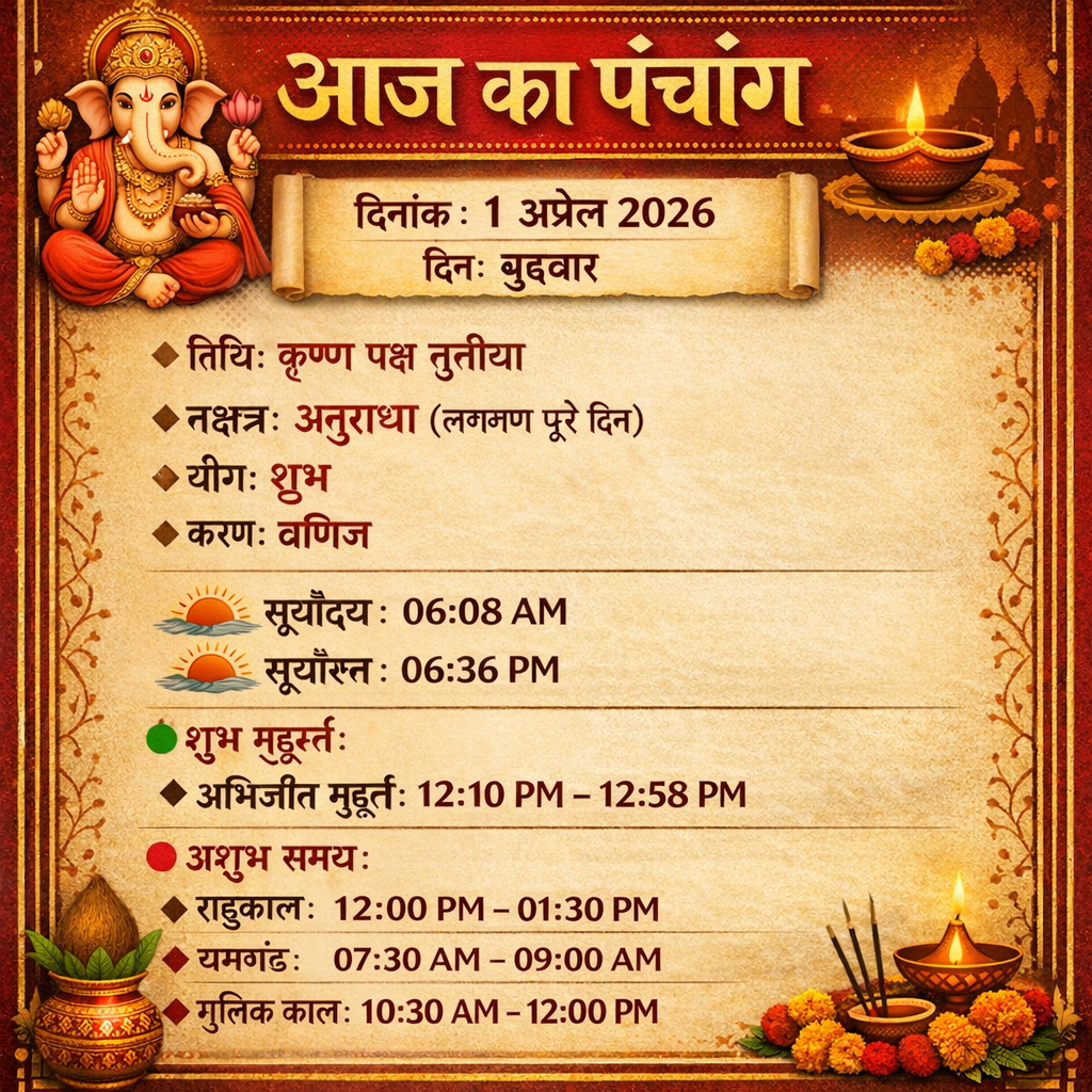 पंचांग राशिफल 01 अप्रैल का पंचांग By demilation - April 1, 2026 0 35 Share Facebook Twitter Google+ Pinterest WhatsApp