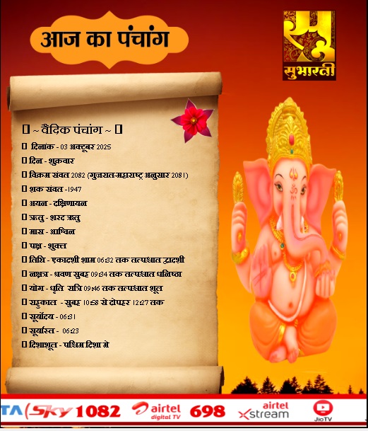 पंचांग राशिफल 03 अक्टूबर का पंचाग By demilation - October 3, 2025 0 55 Share Facebook Twitter Google+ Pinterest WhatsApp