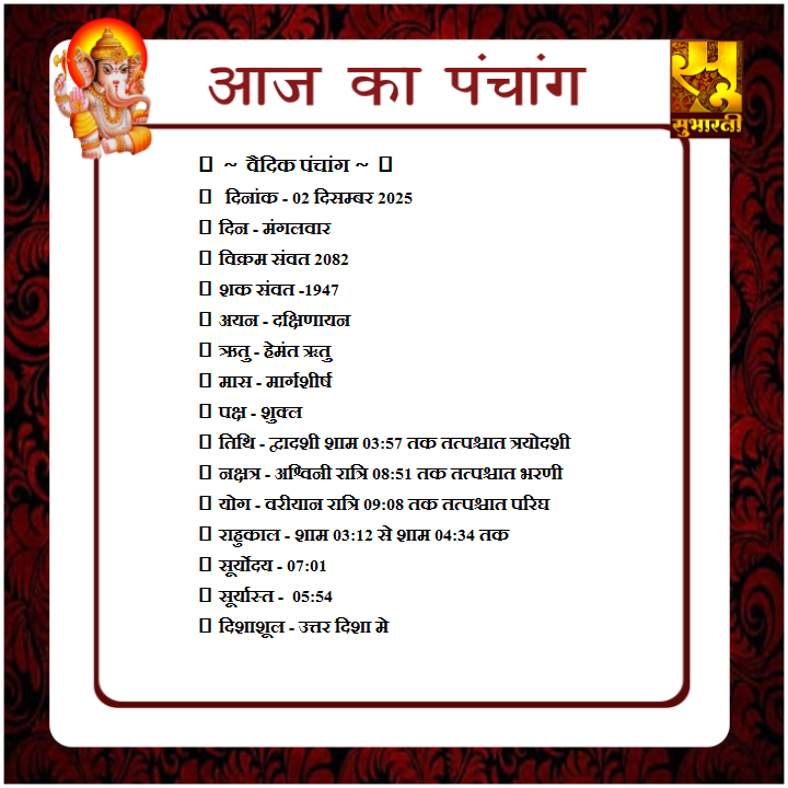 पंचांग राशिफल 02 दिसम्बर का पंचाग By demilation - December 2, 2025 0 42 Share Facebook Twitter Google+ Pinterest WhatsApp
