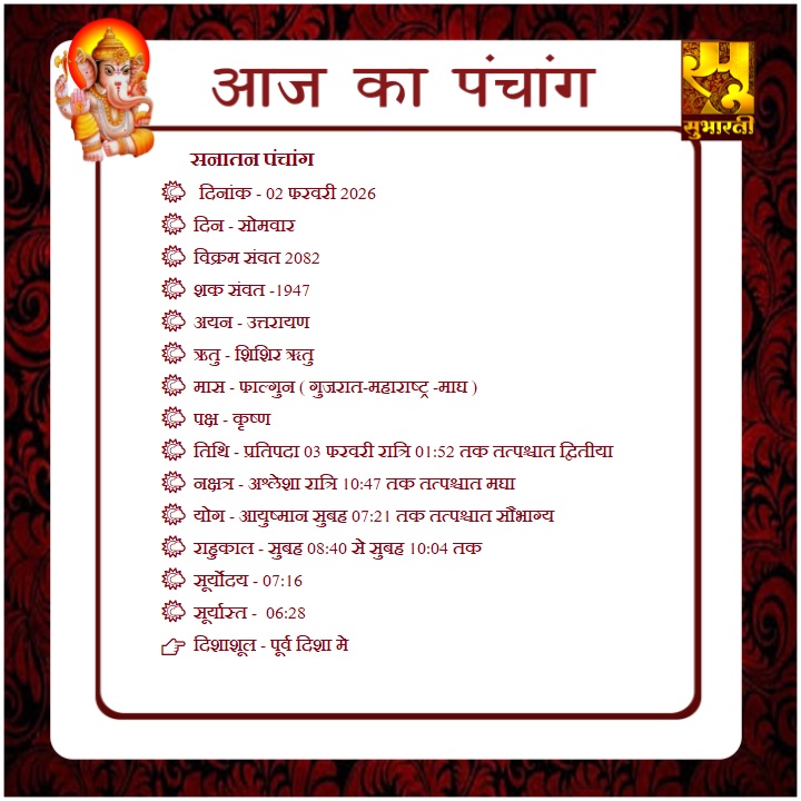 पंचांग राशिफल 02 फरवरी का पंचाग By demilation - February 2, 2026 0 55 Share Facebook Twitter Google+ Pinterest WhatsApp
