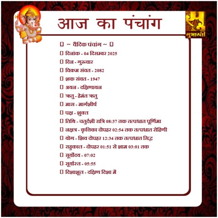 पंचांग राशिफल 04 दिसम्बर का पंचाग By demilation - December 4, 2025 0 73 Share Facebook Twitter Google+ Pinterest WhatsApp