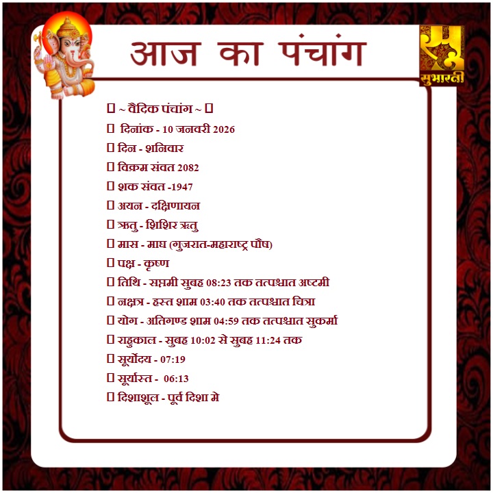 पंचांग राशिफल 10 जनवरी का पंचाग By demilation - January 10, 2026 0 44 Share Facebook Twitter Google+ Pinterest WhatsApp