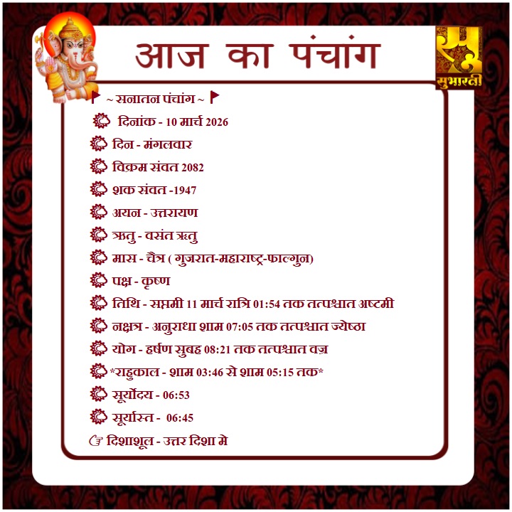 पंचांग राशिफल 10 मार्च का पंचांग By demilation - March 10, 2026 0 10 Share Facebook Twitter Google+ Pinterest WhatsApp