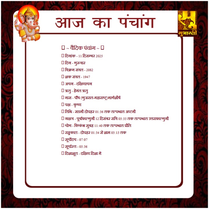 पंचांग राशिफल 11 दिसम्बर का पंचाग By demilation - December 11, 2025 0 32 Share Facebook Twitter Google+ Pinterest WhatsApp