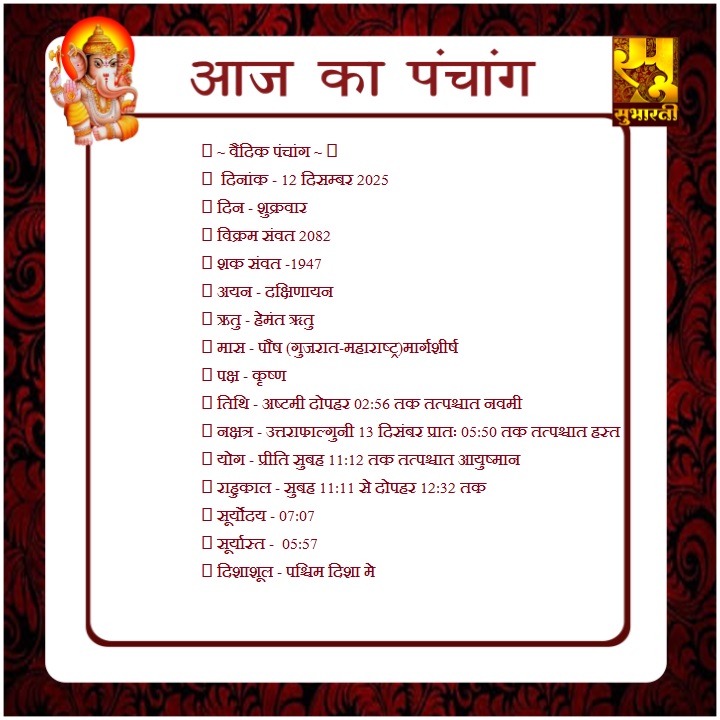 पंचांग राशिफल 12 दिसम्बर का पंचाग By demilation - December 12, 2025 0 60 Share Facebook Twitter Google+ Pinterest WhatsApp