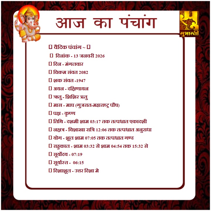 पंचांग राशिफल 13 जनवरी का पंचाग By demilation - January 13, 2026 0 48 Share Facebook Twitter Google+ Pinterest WhatsApp
