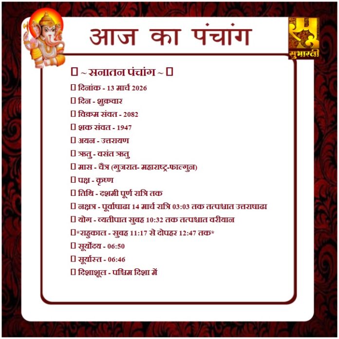 पंचांग राशिफल 13 मार्च का पंचांग By demilation - March 13, 2026 0 10 Share Facebook Twitter Google+ Pinterest WhatsApp