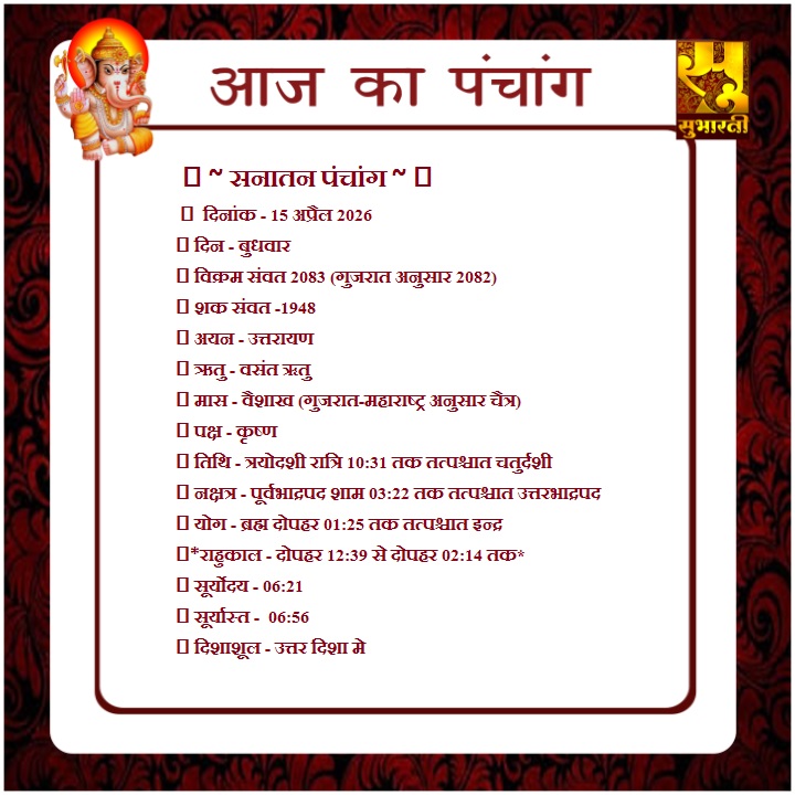पंचांग राशिफल 15 अप्रैल का पंचांग By demilation - April 15, 2026 0 24 Share Facebook Twitter Google+ Pinterest WhatsApp
