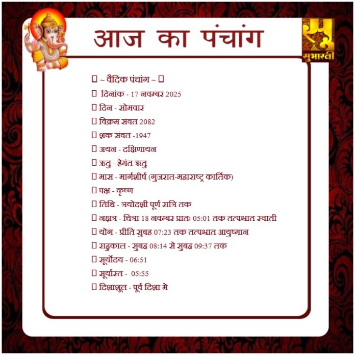 पंचांग राशिफल 17 नवम्बर का पंचाग By demilation - November 17, 2025 0 57 Share Facebook Twitter Google+ Pinterest WhatsApp