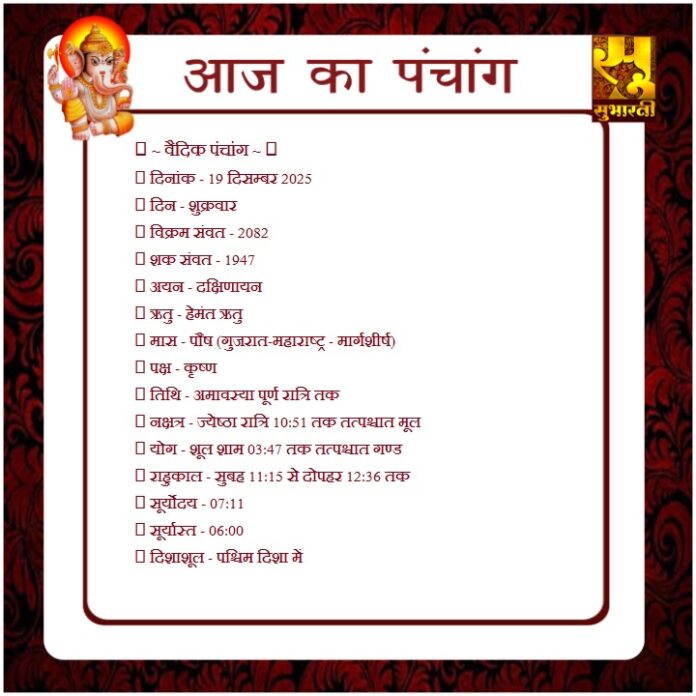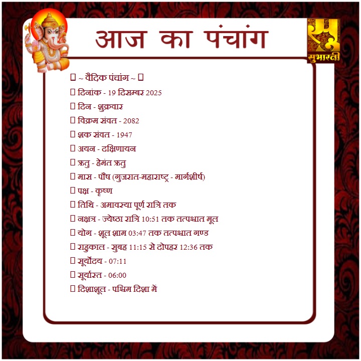 पंचांग राशिफल 19 दिसम्बर का पंचाग By demilation - December 19, 2025 0 53 Share Facebook Twitter Google+ Pinterest WhatsApp