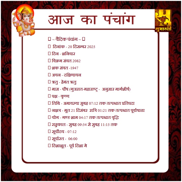 पंचांग राशिफल 20 दिसम्बर का पंचाग By demilation - December 20, 2025 0 75 Share Facebook Twitter Google+ Pinterest WhatsApp