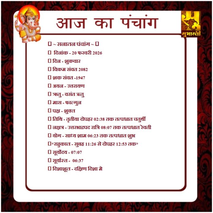 पंचांग राशिफल 20 फरवरी का पंचांग By demilation - February 20, 2026 0 42 Share Facebook Twitter Google+ Pinterest WhatsApp