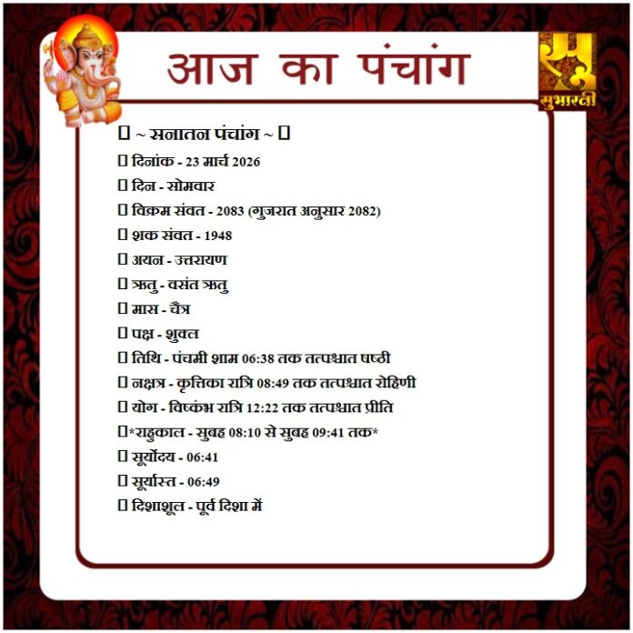 पंचांग राशिफल 23 मार्च का पंचांग By demilation - March 23, 2026 0 42 Share Facebook Twitter Google+ Pinterest WhatsApp