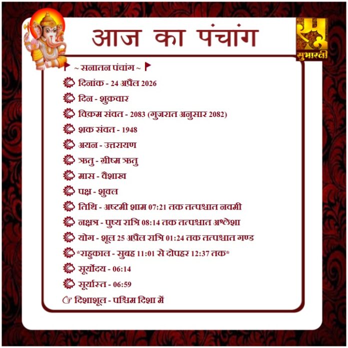 पंचांग राशिफल 24 अप्रैल का पंचांग By demilation - April 24, 2026 0 8 Share Facebook Twitter Google+ Pinterest WhatsApp