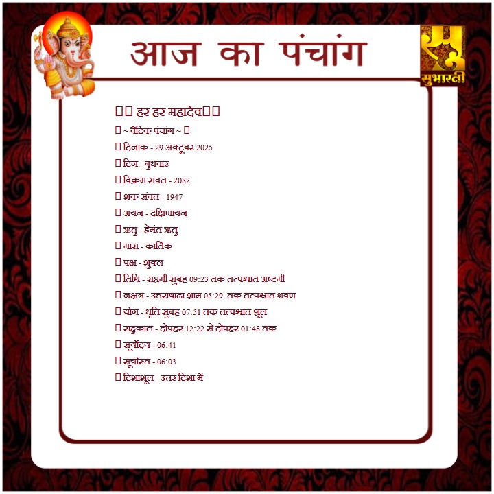 पंचांग राशिफल 29 अक्टूबर का पंचाग By demilation - October 29, 2025 0 92 Share Facebook Twitter Google+ Pinterest WhatsApp