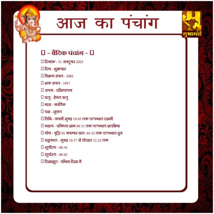 पंचांग राशिफल 31 अक्टूबर का पंचाग By demilation - October 31, 2025 0 77 Share Facebook Twitter Google+ Pinterest WhatsApp