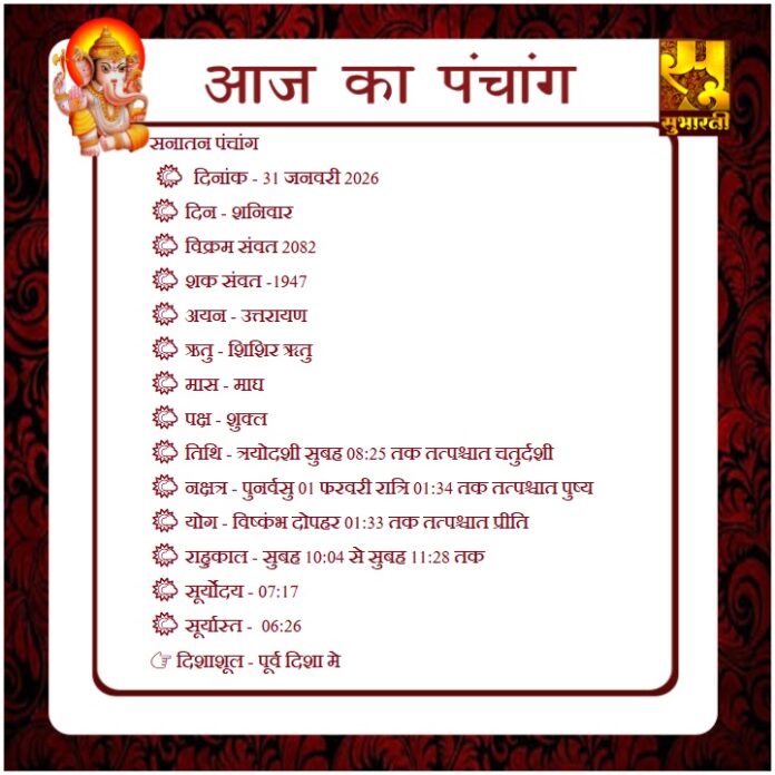 पंचांग राशिफल 31 जनवरी का पंचाग By demilation - January 31, 2026 0 47 Share Facebook Twitter Google+ Pinterest WhatsApp