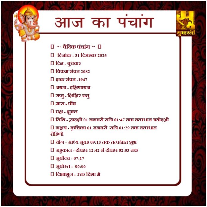 पंचांग राशिफल 31 दिसम्बर का पंचाग By demilation - December 31, 2025 0 48 Share Facebook Twitter Google+ Pinterest WhatsApp